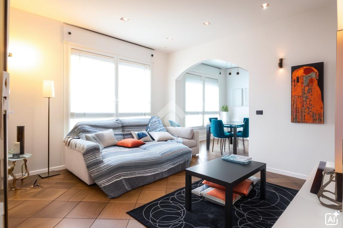 L'immobile, servito da ascensore, offre una disposizione funzionale e accogliente. All'ingresso, un soggiorno e una cucina separata da un elegante arco creano un ambiente ideale per la vita quotidiana.